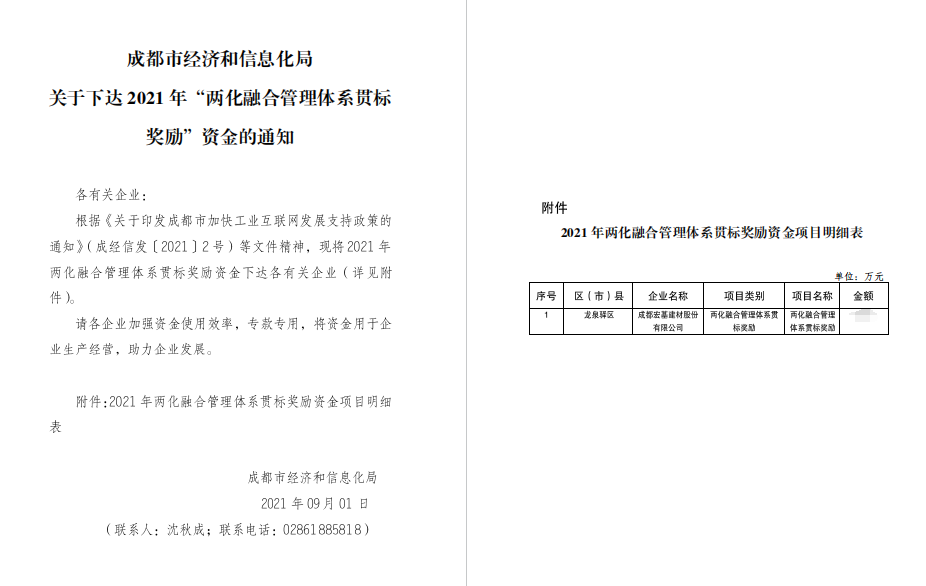 2021年9月1日,成都宏基建材股份有限公司兩化融合管理體系貫標獎勵項目順利通過成都市經濟和信息化局的最終公示,獲得政府獎勵金。