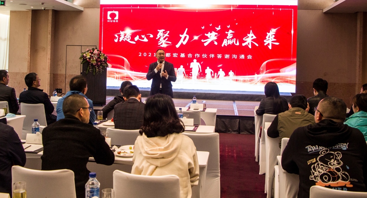 2021年3月25日,成都宏基合作伙伴答謝溝通會(huì)在凱賓斯基酒店舉行。公司董事長兼總裁吳逸云先生攜高管團(tuán)隊(duì)、物資、生產(chǎn)系統(tǒng)同事出席,近七十位供應(yīng)、服務(wù)合作伙伴應(yīng)邀赴會(huì)。