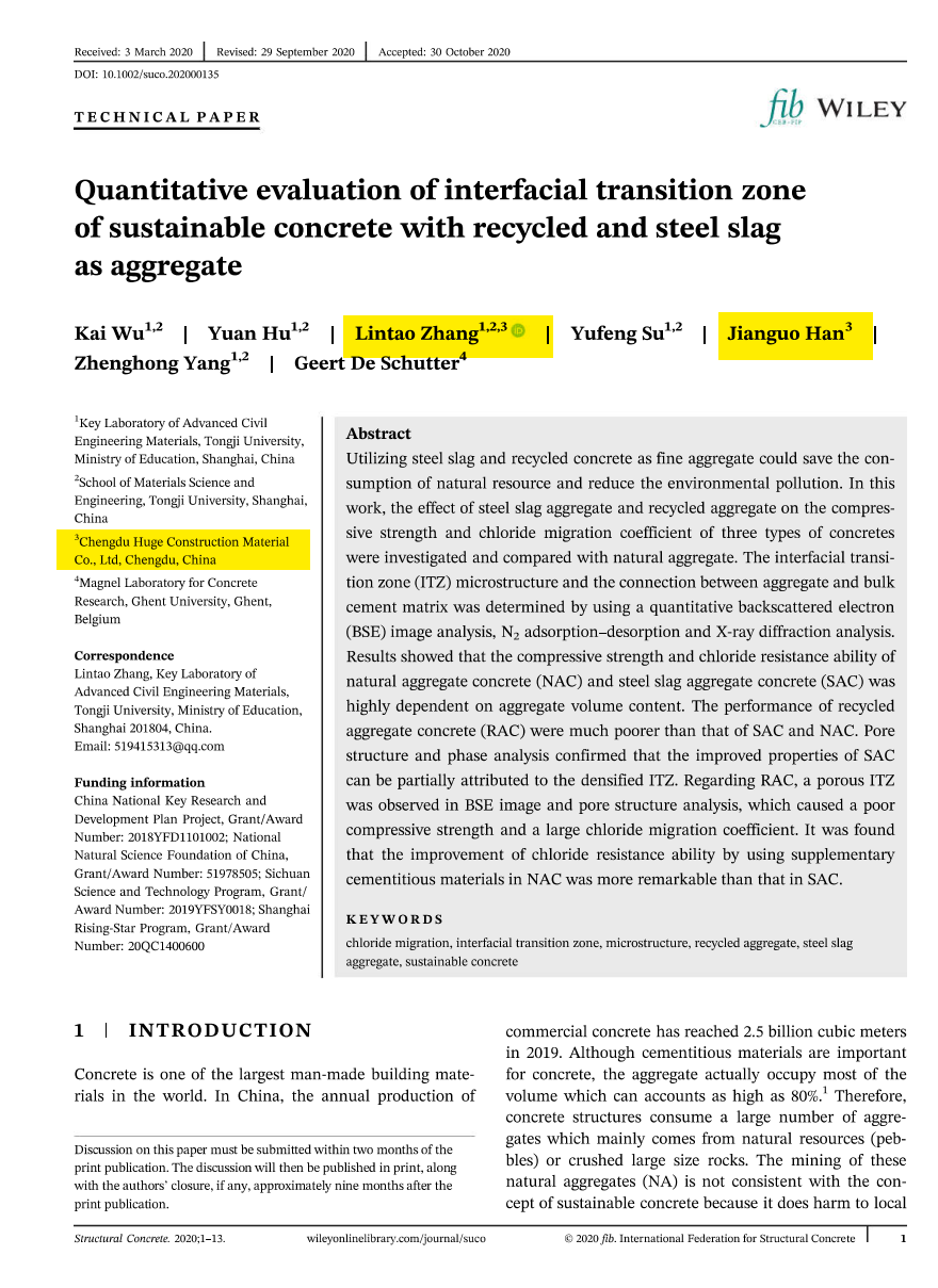 近日,我司技術(shù)團隊與同濟大學(xué)材料學(xué)院于SCI期刊《Structural Concrete》上發(fā)表Quantitative evaluation of interfacial transition zone of sustainable concrete with recycled and steel slag as aggregate的論文,該文第一作者為同濟大學(xué)吳凱副教授,通訊作者為宏基質(zhì)量管理部張林濤,合作作者為宏基質(zhì)量管理部副總工程師韓建國先生、同濟大學(xué)胡源碩士、蘇宇峰教授、楊正宏教授,比利時根特大