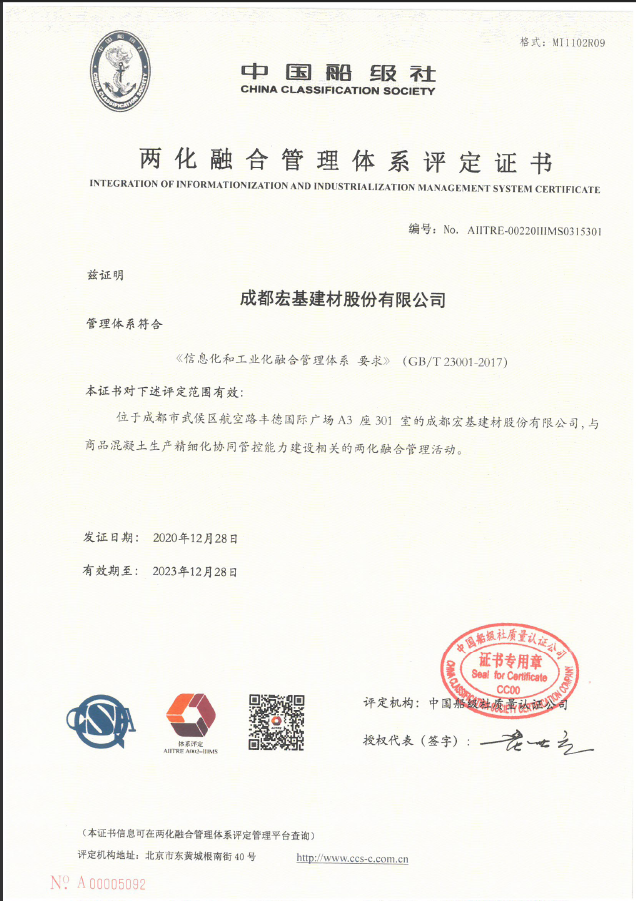 12月25日,成都宏基建材股份有限公司兩化融合管理體系通過工信部最終審核,順利獲得國家兩化融合管理體系評定工作委員會頒發(fā)的兩化融合管理體系評定證書。標志著公司的兩化融合獲得權(quán)威機構(gòu)的肯定。
