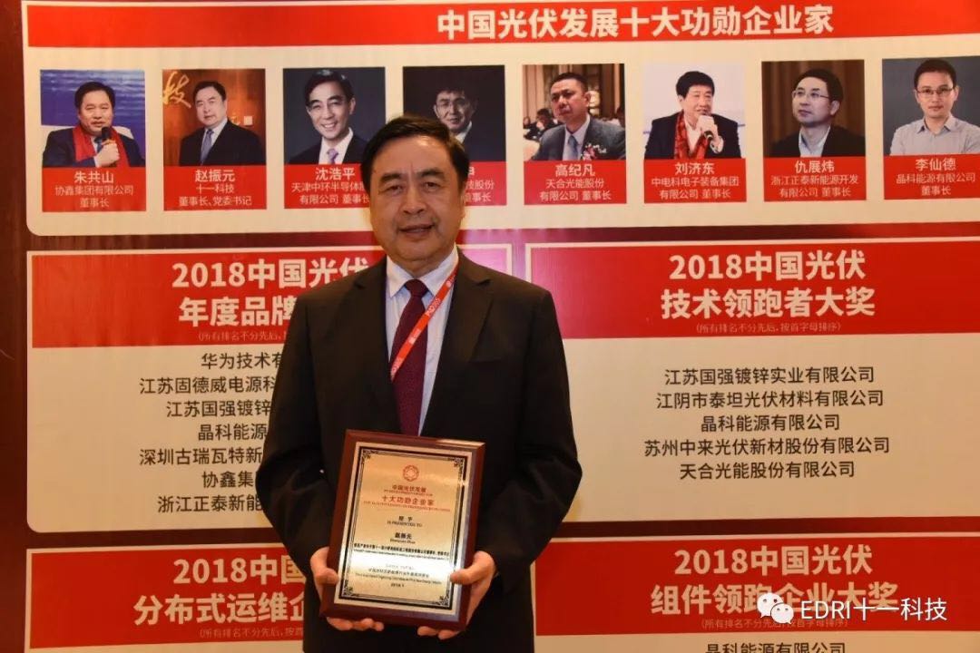 趙振元同志受邀親臨頒獎(jiǎng)典禮,頒獎(jiǎng)詞中講到:趙振元帶領(lǐng)十一科技成功地從電子轉(zhuǎn)型到新能源,成為中國(guó)最大的光伏發(fā)電設(shè)計(jì)商及光伏發(fā)電承包商之一,為中國(guó)的光伏發(fā)電事業(yè)作出了突出貢獻(xiàn)。他是光伏界的著名詩(shī)人,他的詩(shī)歌鼓舞著新能源界越過(guò)冬天,走向春天!頒獎(jiǎng)儀式后,趙振元同志接受采訪時(shí)說(shuō):光伏行業(yè)的發(fā)展在2018年發(fā)生了巨大的變化,但是希望各企業(yè)、各同仁團(tuán)結(jié)一致,同舟共濟(jì),在龍頭企業(yè)和企業(yè)家的帶領(lǐng)下,勇往直前。