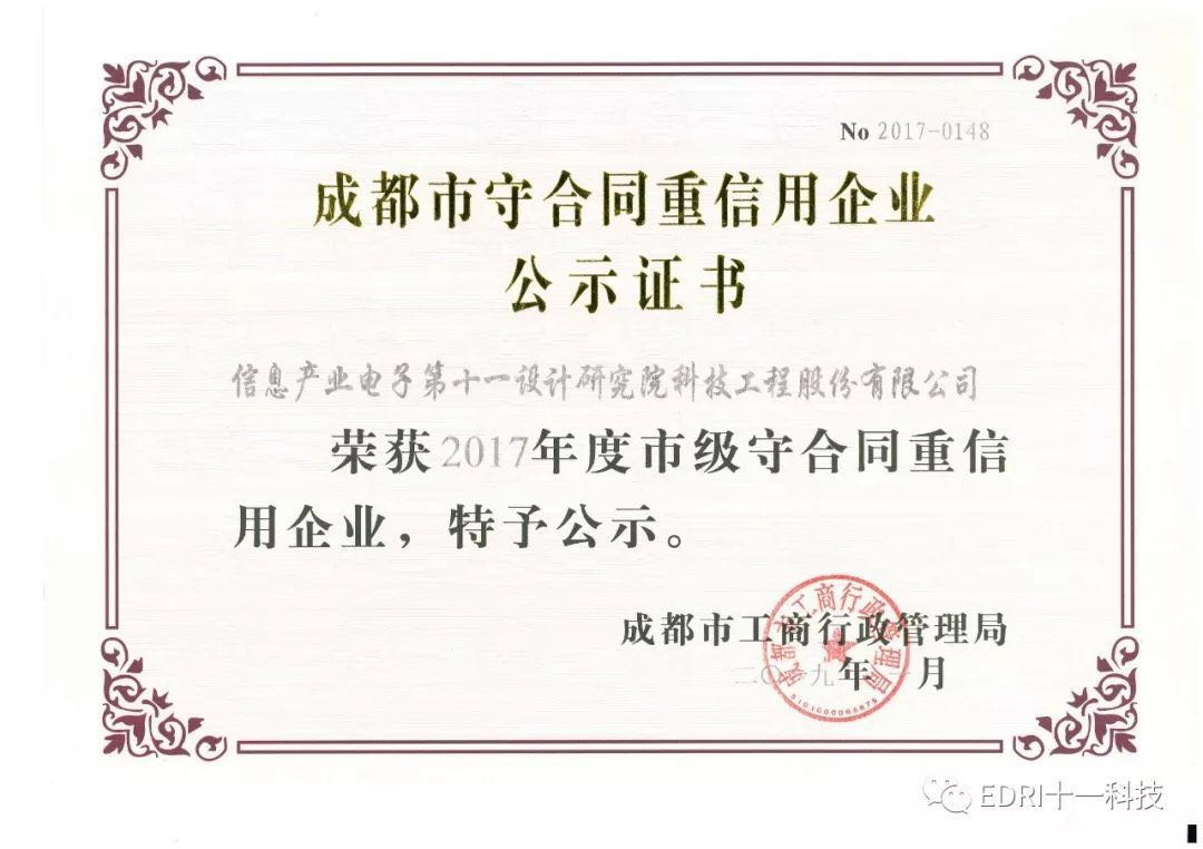 十一科技榮獲2017年度成都市市級(jí)“守合同重信用”企業(yè)
