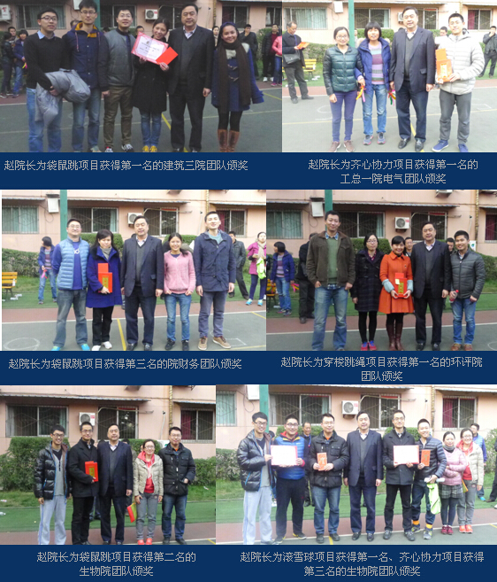 團(tuán)體賽結(jié)束后,趙院長給獲獎團(tuán)隊(duì)頒獎并合影留念。取得團(tuán)體賽四個項(xiàng)目前三名的分別是:袋鼠跳項(xiàng)目第一名建筑三院、第二名生物院、第三名院財(cái)務(wù);穿梭跳繩項(xiàng)目第一名環(huán)評院、第二名院財(cái)務(wù)、第三名工總二院電氣;齊心協(xié)力項(xiàng)目第一名工總一院電氣、第二名工總一院結(jié)構(gòu)、第三名生物院;滾雪球項(xiàng)目第一名生物院、第二名建筑三院、第三名院辦和工總一院電氣(并列)。院黨委副書記王珩在賽后講話中希望大家把永爭第一的拼搏精神帶到學(xué)習(xí)和工作中去,為十一科技更好更快地發(fā)展而努力。