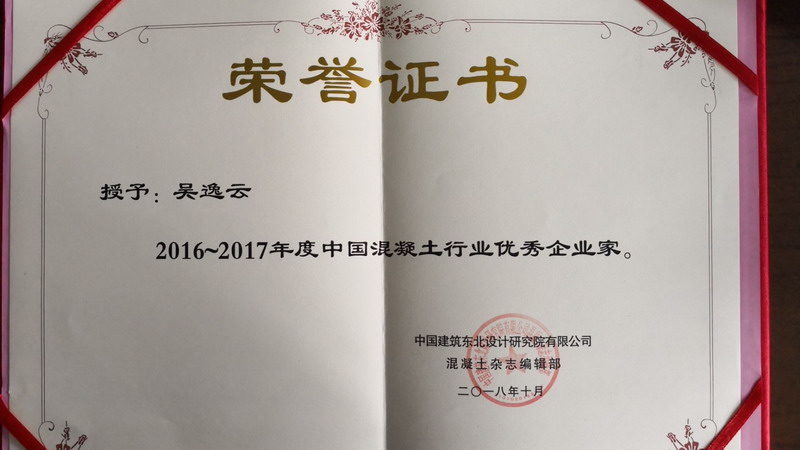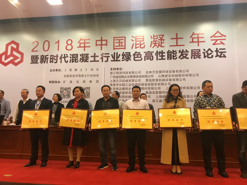 2018年10月22日,由中國(guó)混凝土協(xié)會(huì)舉辦年會(huì)——暨新時(shí)代混凝土行業(yè)綠色高性能發(fā)展論壇在浙江杭州召開(kāi),公司董事長(zhǎng)吳逸云、生產(chǎn)副總監(jiān)董譽(yù)、綜合管理部副經(jīng)理王洵應(yīng)邀參加論壇。成都宏基建材股份有限公司獲得2016-2017年度中國(guó)混凝土行業(yè)優(yōu)秀企業(yè)榮譽(yù)稱號(hào),董事長(zhǎng)吳逸云被評(píng)為2016-2017年度中國(guó)混凝土行業(yè)優(yōu)秀企業(yè)家。
