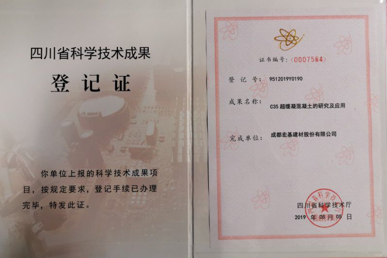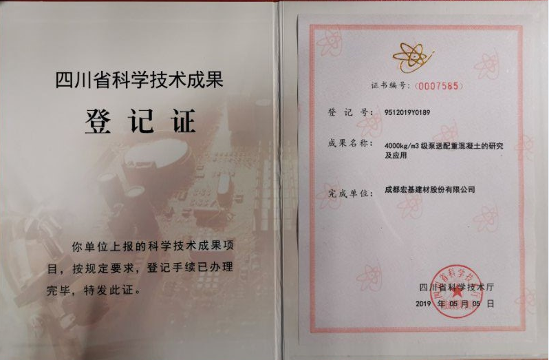 2019年5月5日,成都宏基榮獲兩項(xiàng)由省科學(xué)技術(shù)廳頒發(fā)的“國(guó)內(nèi)領(lǐng)先”技術(shù)成果登記證書(shū)。獲得此次科學(xué)技術(shù)成果登記證書(shū)的“泵送配重混凝土和超緩凝混凝土的研究及應(yīng)用”,由公司研發(fā)團(tuán)隊(duì)的技術(shù)人員共同努力完成,該兩項(xiàng)成果的研發(fā)及前期實(shí)用獲得了多項(xiàng)專(zhuān)利,并在地鐵、橋梁等工程項(xiàng)目中得到實(shí)際應(yīng)用,經(jīng)濟(jì)和環(huán)境效益顯著。