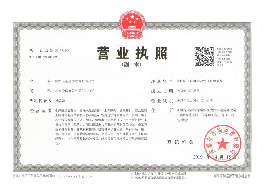 成都宏基建材股份有限公司于2019年11月18日在成都市市場(chǎng)監(jiān)督管理局完成工商變更登記。原注冊(cè)地“成都市青羊區(qū)王家塘巷8號(hào)”變更為“四川省成都市龍泉驛區(qū)大面街道成龍大道二段888號(hào)成都(國(guó)家級(jí))經(jīng)開區(qū) C6(棟)2層物業(yè)”。至此,我司順利落戶成都市龍泉驛區(qū)。