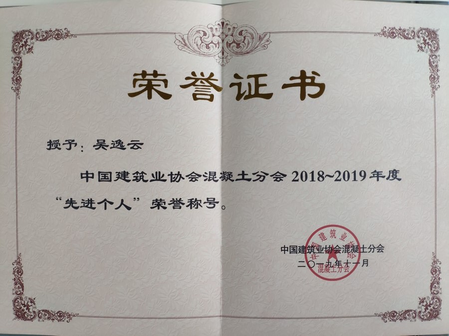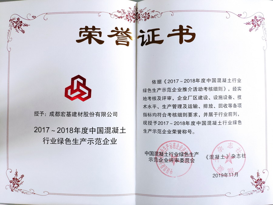 2019年11月25日至29日,由中國建筑業(yè)協(xié)會混凝土分會主辦的2019年中國混凝土年會暨混凝土行業(yè)高質(zhì)量發(fā)展論壇在廣東珠海隆重舉行,會上成都宏基建材股份有限公司再次獲得2017-2018年度中國混凝土行業(yè)綠色生產(chǎn)示范企業(yè)榮譽稱號,公司董事長兼總裁吳逸云先生被評為中國建筑業(yè)協(xié)會混凝土分會2018-2019年度“先進(jìn)個人”。