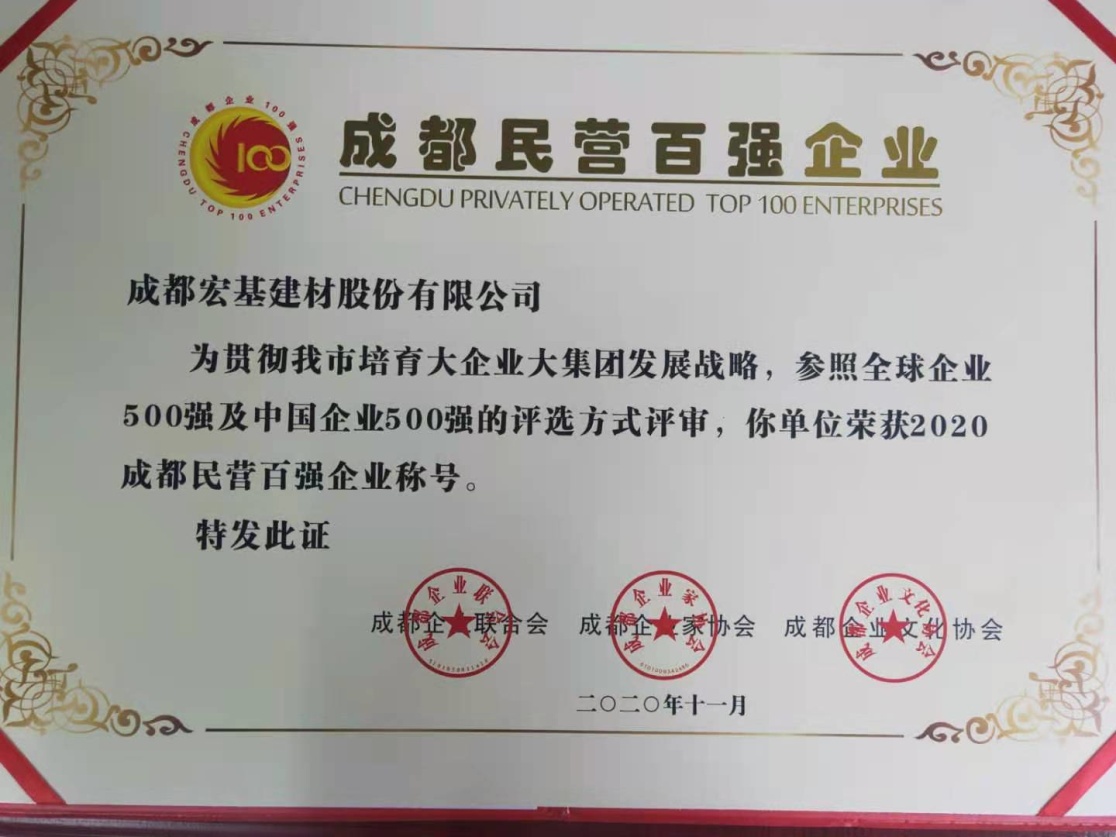 11月5日,由成都企業(yè)聯(lián)合會(huì)、成都企業(yè)家協(xié)會(huì)、成都企業(yè)文化協(xié)會(huì)(“三會(huì)合一”,以下簡(jiǎn)稱(chēng)“成企聯(lián)”)舉辦的2020年第十屆成都百?gòu)?qiáng)企業(yè)發(fā)布會(huì)暨企業(yè)數(shù)字化轉(zhuǎn)型高峰論壇在蓉召開(kāi),成都宏基建材股份有限公司再次成功入圍民營(yíng)企業(yè)百?gòu)?qiáng)企業(yè)榜單。
