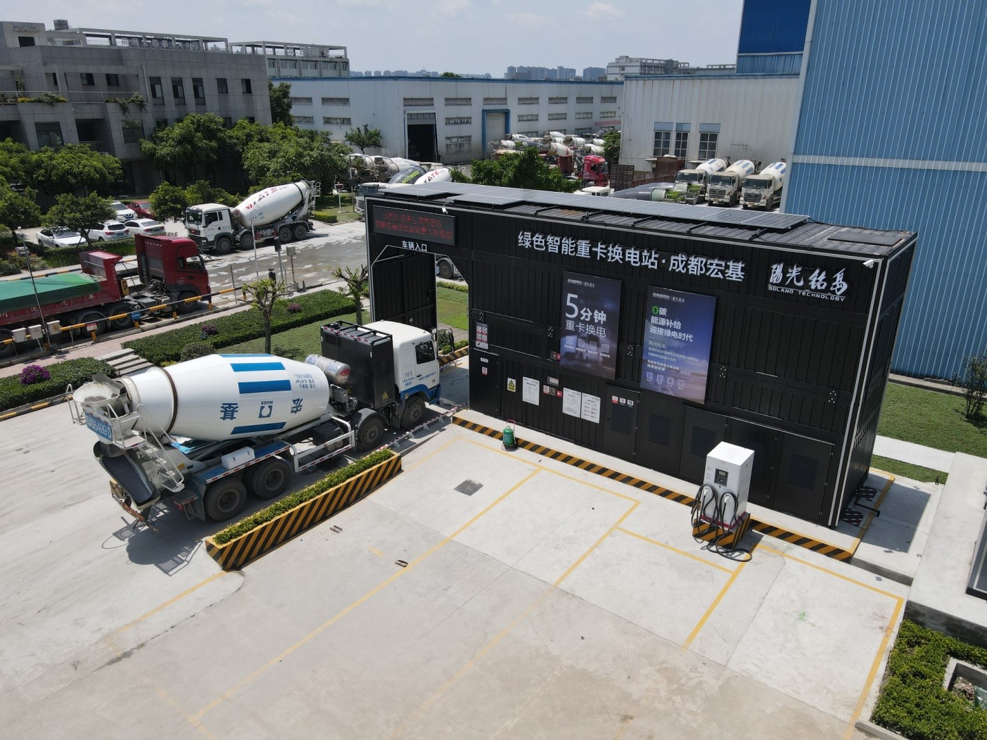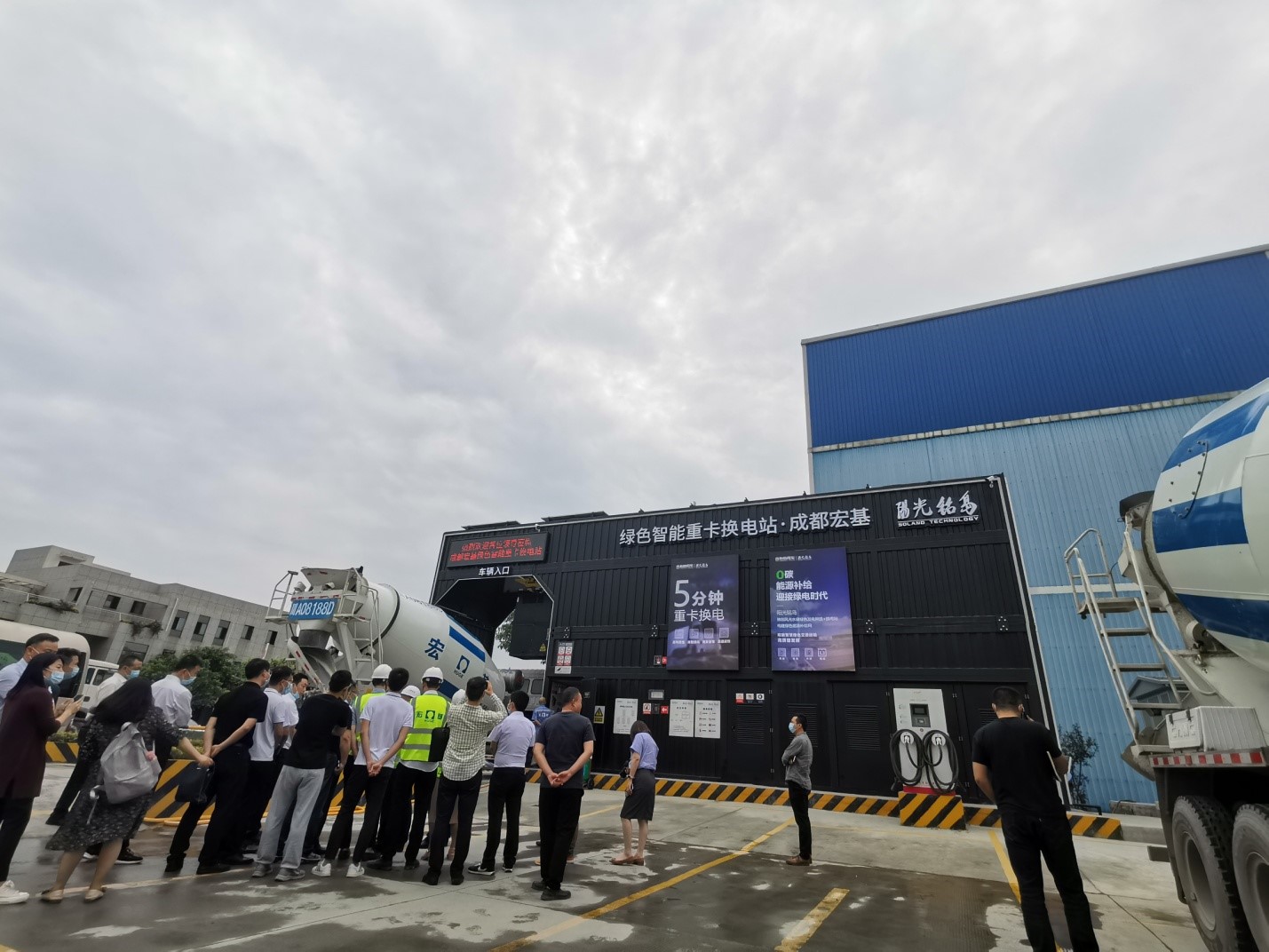 位于蓉西分公司內(nèi),西南地區(qū)首座,充滿了科技感的綜合能源重卡換電站吸引了各領(lǐng)導(dǎo)、專家的關(guān)注,他們詳細(xì)詢問并觀摩了新能源攪拌車的換電過程。吳總向來賓介紹了這換電站和新能源攪拌車的建設(shè)運營情況,對來賓們各項運營數(shù)據(jù)的詢問進(jìn)行了解答。