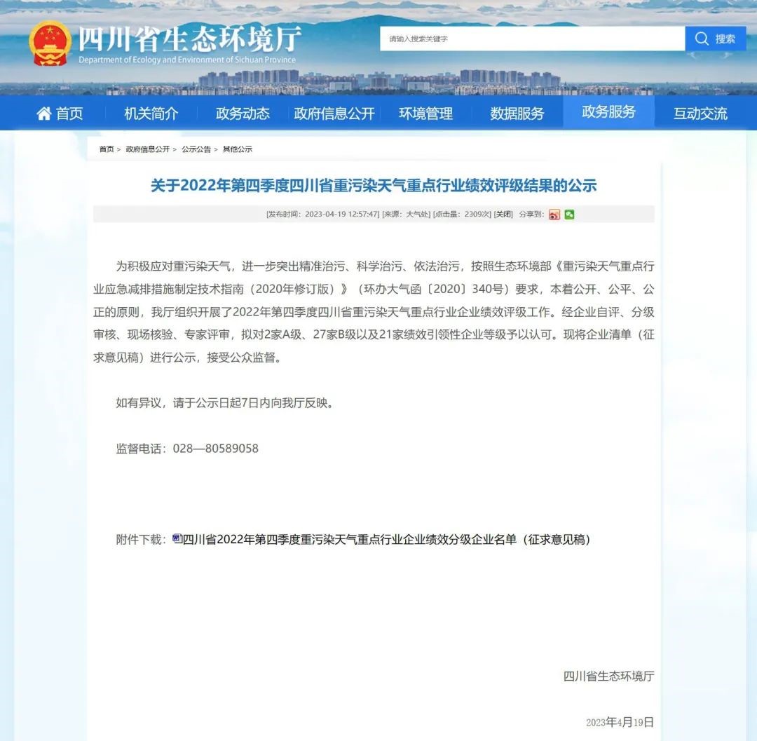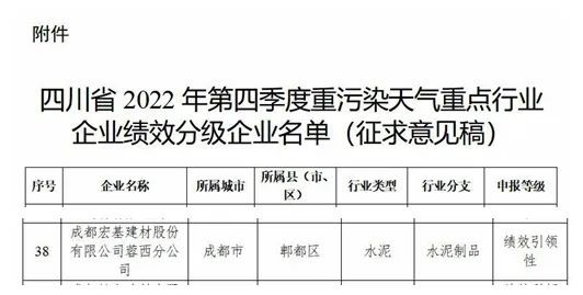 近日,四川省生態(tài)環(huán)境廳發(fā)布2022年第四季度四川省重污染天氣重點行業(yè)績效評級結(jié)果,我司蓉西分公司榜上有名。