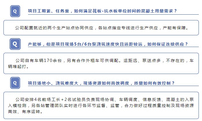 “連續(xù)供應(yīng)、保質(zhì)量、保數(shù)量”,這是客戶最簡(jiǎn)單也是最嚴(yán)苛的訴求,為順利完成筏板-抗水板澆筑供應(yīng)保障,公司生產(chǎn)保供團(tuán)隊(duì)第一時(shí)間進(jìn)行現(xiàn)場(chǎng)查勘、確認(rèn)澆筑方案、排查潛在風(fēng)險(xiǎn),從技術(shù)方案制定-原材料籌備-生產(chǎn)保障-運(yùn)輸保障-泵送保障-應(yīng)急保障等各環(huán)節(jié)、各維度著手進(jìn)行細(xì)致交底、工作部署。凡事預(yù)則立,我們只為做的更好。