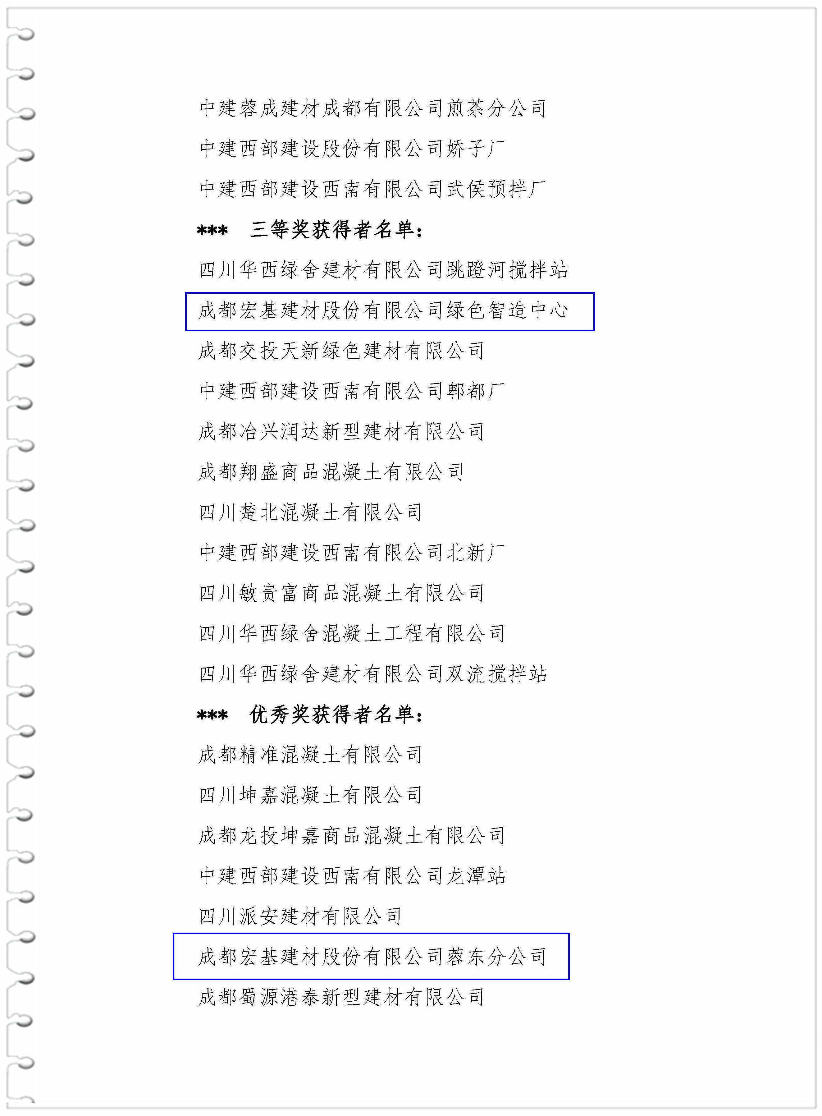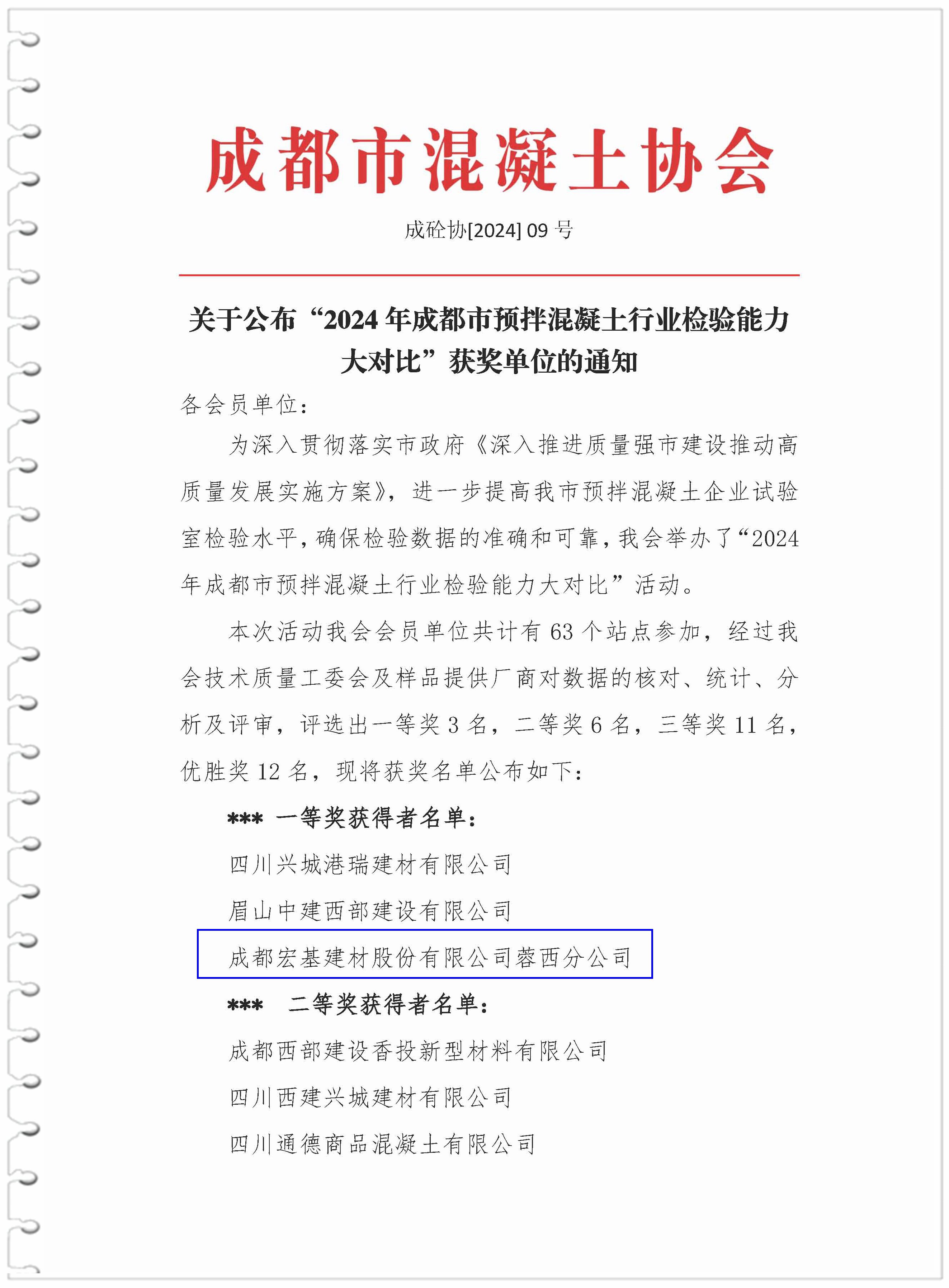 9月27日,由成都市混凝土協(xié)會舉辦的“2024年成都市預(yù)拌混凝土行業(yè)檢驗?zāi)芰Υ髮Ρ取被顒庸剂嗽u選結(jié)果,成都宏基三個生產(chǎn)站點(diǎn)均榮獲獎項!
