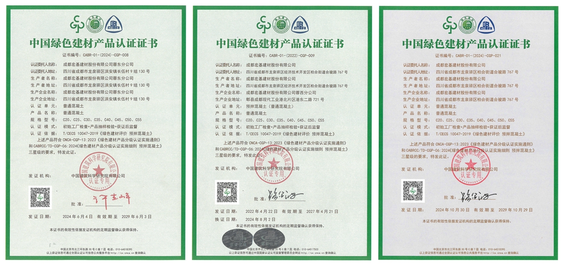 在追求可持續(xù)發(fā)展的今天,綠色建材已成為建筑行業(yè)轉(zhuǎn)型升級的重要方向。2024年10月30日成都宏基建材股份有限公司綠色建材智造中心產(chǎn)品獲得中國綠色建材產(chǎn)品三星級認(rèn)證,自此公司在蓉三個基地(綠色建材智造中心、蓉西分公司、蓉東分公司)生產(chǎn)的混凝土產(chǎn)品均獲得中國綠色建材產(chǎn)品三星級認(rèn)證。這不僅是對成都宏基長期致力于綠色生產(chǎn)的認(rèn)可,也體現(xiàn)了我們在推動綠色建材行業(yè)發(fā)展中的積極貢獻。